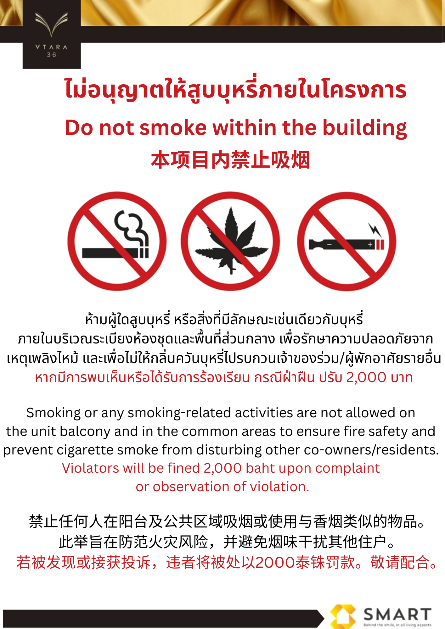 5.) Anyone who counterfeits a key card or uses it without authorization to use the parking spaces of Vtara Sukhumvit 36 shall be subject to a fine of 2,000 baht and may have their parking rights suspended, along with the suspension of public utility services, and may face legal action.